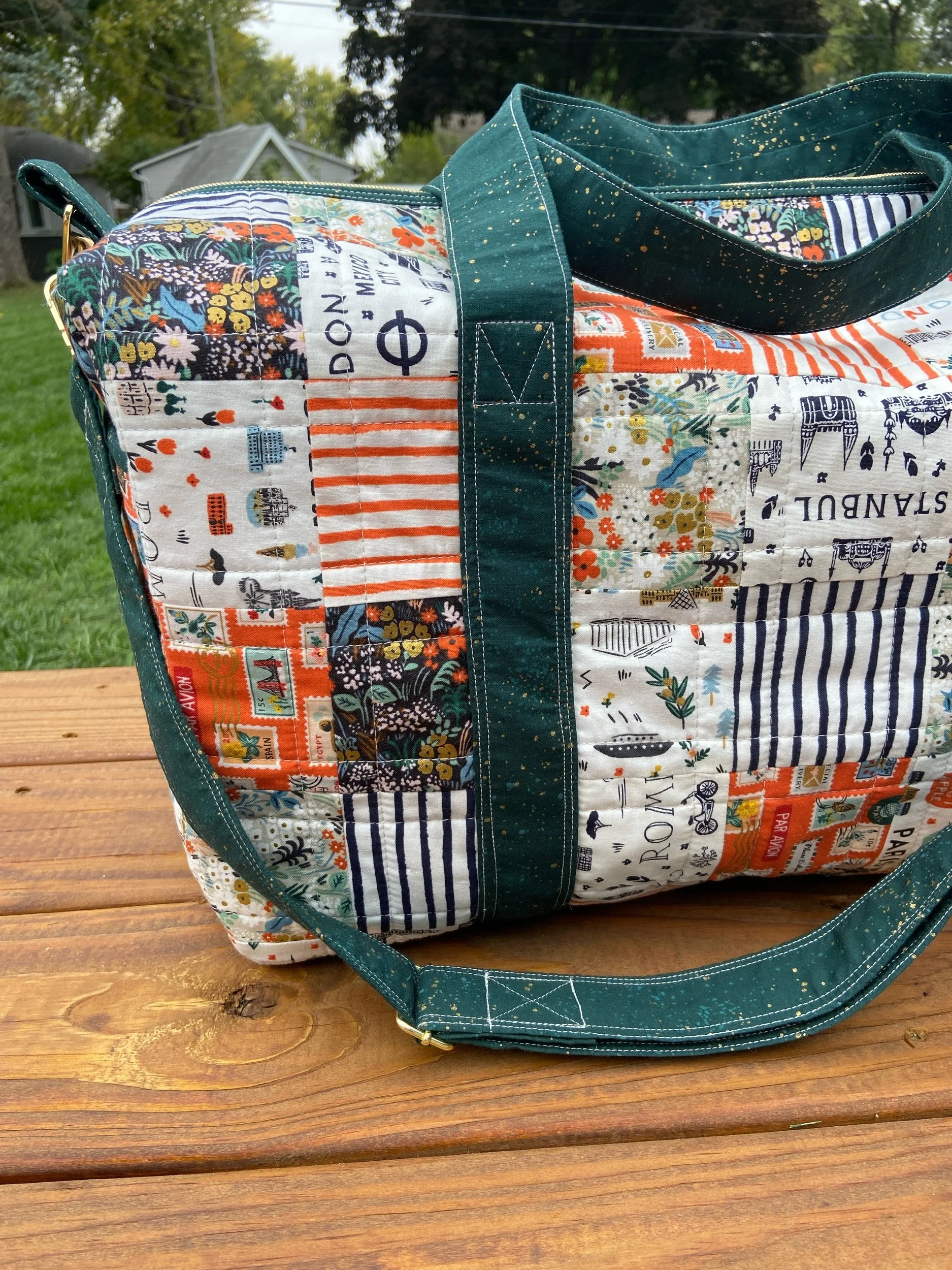 Made with Rifle Paper Company travel inspired fabrics. This handmade duffle bag is waiting to go on your next adventure! Finished size - 12”H x 20.5” W x 9”D
